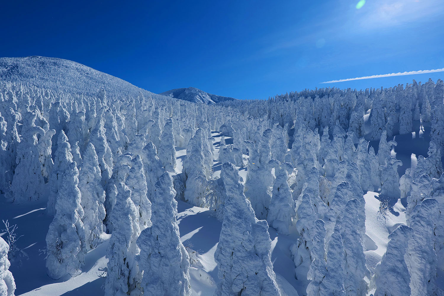 Les « monstres de neige » qui se forment par l'accumulation du givre et de la neige sur les arbres, sont le résultat d'un phénomène naturel d'une grande rareté, né de conditions météorologiques exceptionnelles au niveau mondial. Les plus grands d'entre eux peuvent atteindre jusqu'à 10 mètres de haut. Ce paysage argenté visible depuis un téléphérique et les sources thermales d'un blanc laiteux situées au pied de la montagne incarnent exactement l'hiver à Zao.